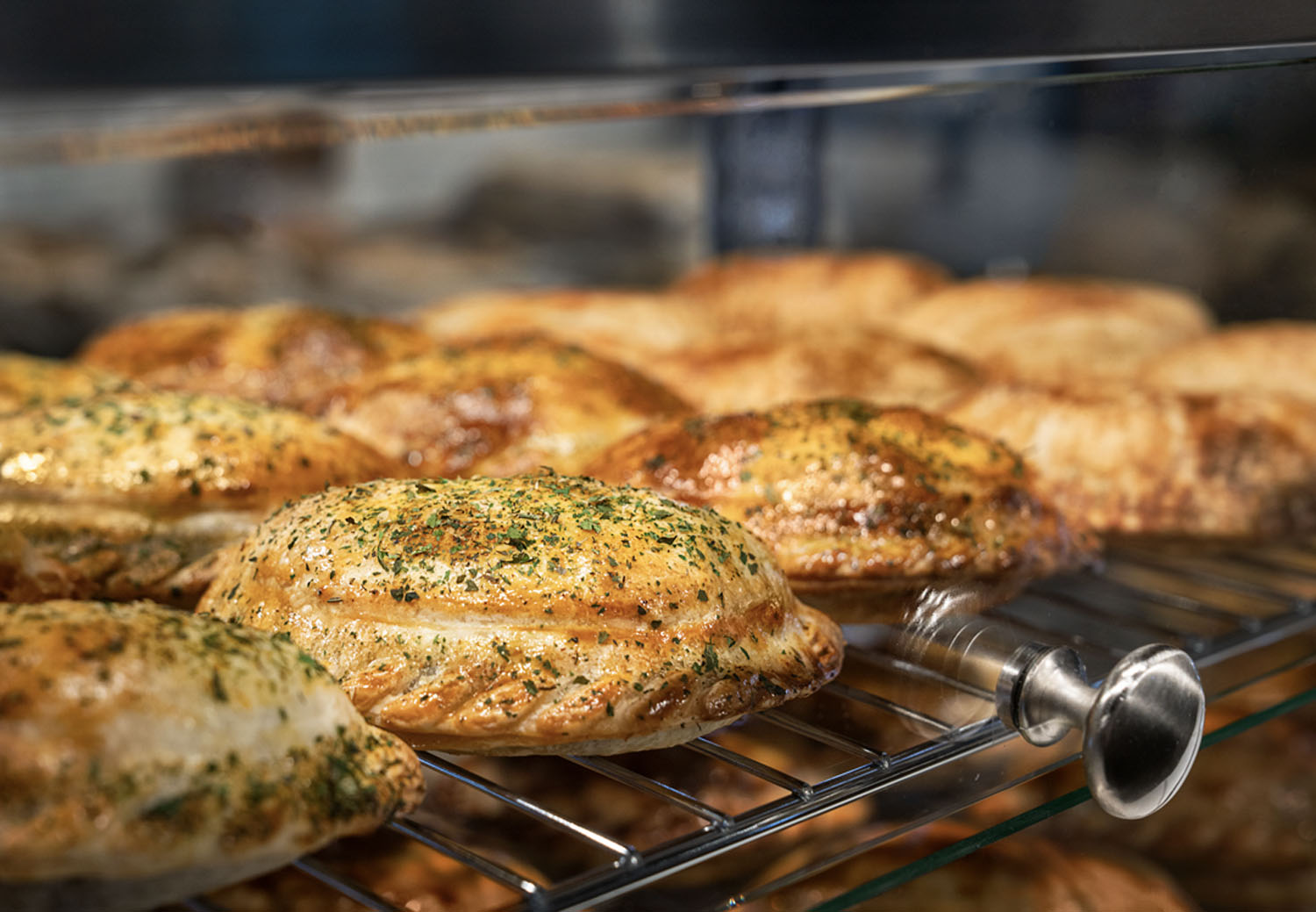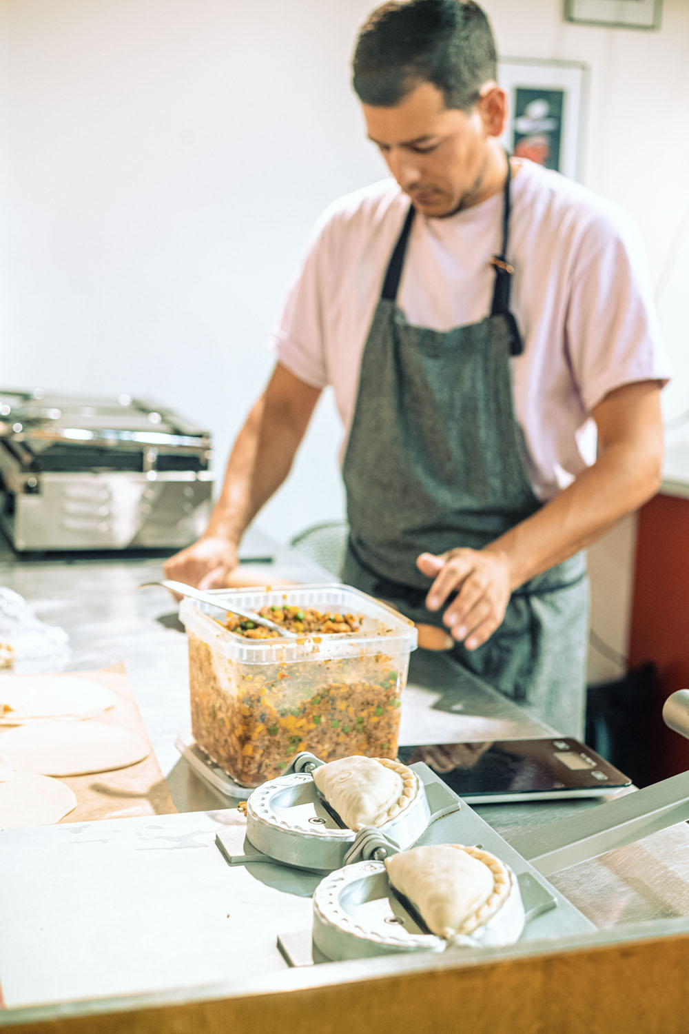 In den Teig gepackt wird der Geschmack von Hand, danach geht’s in den Backofen statt in die Fritteuse. Die Zutaten kaufen wir bei regionalen Produzenten, das Gemüse kommt aus dem Seeland, das Fleisch vom lokalen Metzger. Damit das, was wir über die Theke reichen, alle glücklich macht.